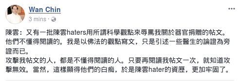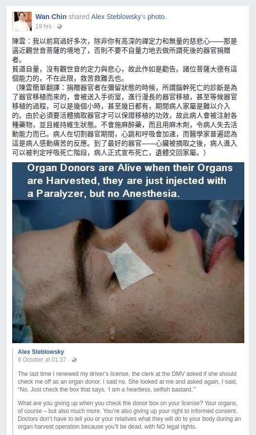陳雲轉載的貼文,圖片及文字最初來自一個叫做 The Illusion of Science 的陰謀論專頁,流言破解網站 Snopes 判定為「未證實」,明確指出「沒有證據顯示臨床死亡、腦死亡或經驗心臟死亡的器官捐贈者,能在器官捐贈過程中感到痛楚。」[2]