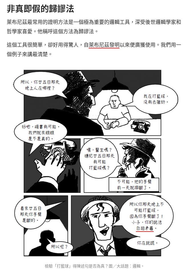 - 我少讀邏輯史,但說歸謬法是Leibniz發明未免與歷史相差太遠。古希臘時期的數學已使用反證法,例如質數有無限多個、2的平方根是無理數的證明。