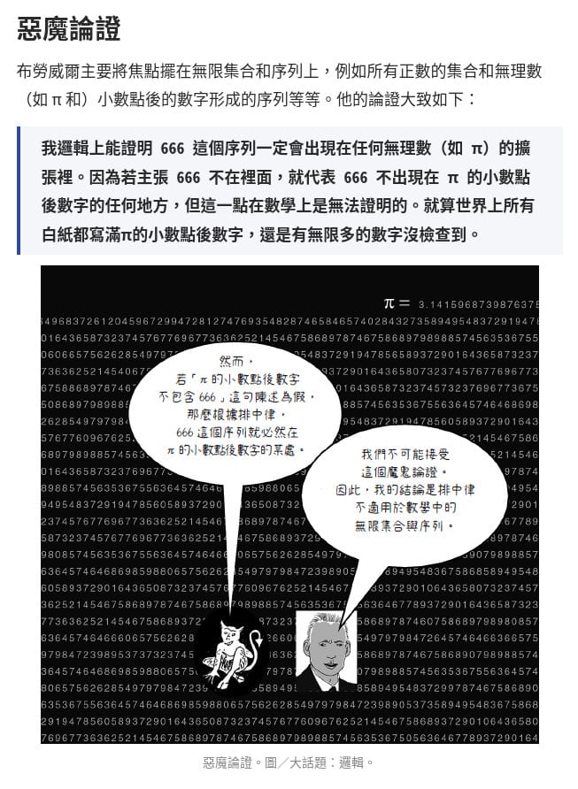 也僅代表「π 的小數點後數字不包含666」這句無法證明,而非像圖中那「惡魔」所言「這句陳述為假」(此處更假設了它屬實³),我無法理解這個「惡魔論證」如何「邏輯上能證明」 π 的小數點後會出現「666」。