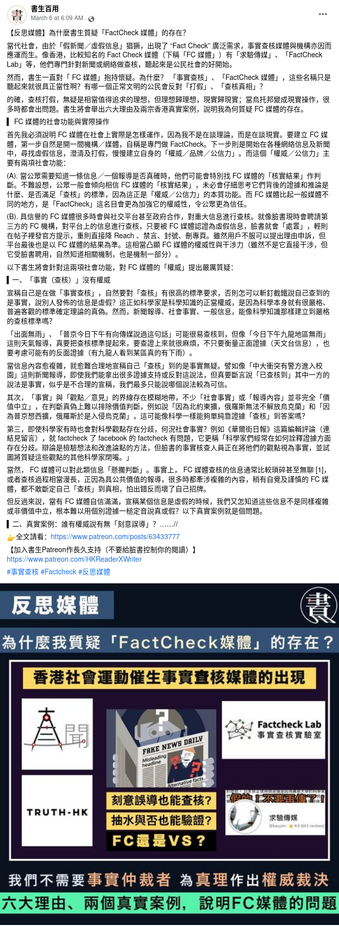 當然,我們不應該只看標題。從內文判斷,我猜他的意思是事實查核機構(文中稱為「FC媒體」)實際操作上產生很多問題,以致不應該或不需要存在。由於我沒有訂閱他的Patreon未能讀到全文,無法拜讀他提出的「六大理由及兩宗香港真實案例」(Facebook帖文僅公開了第一點「『事實(查核)』沒有權威」),本人也無法評論太多。