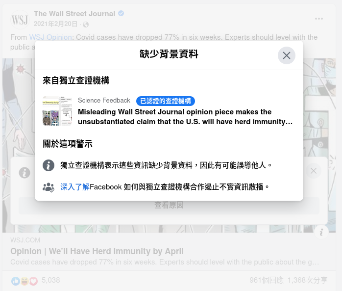 事緣《華爾街日報》2021年2月18日刊登了Johns Hopkins大學醫學院及公共衛生學院教授Marty Makary的文章,宣稱同年4月美國會達至群體免疫(標題為〈We’ll Have Herd Immunity by April〉),而這篇文章被事實查核機構Health Feedback判定為誤導。由於Health Feedback參與了Facebook第三方事實查核計畫,所以有關的Facebook帖文會顯示「缺少背景資料」(missing context)的訊息,點選「查看原因」可以見到Health Feedback(屬於Science Feedback,所以下圖顯示為Science Feedback)的文章連結︰