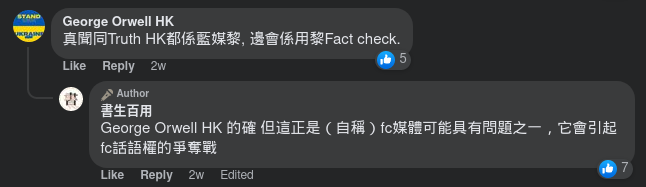 「書生百用」的帖文下有讀者表示「Truth HK」和「真聞」是「藍媒」(在香港指親建制派的媒體)而非真正的事實查核機構,「書生」同意,又指「但這正是(自稱)fc媒體可能具有問題之一,它會引起fc話語權的爭奪戰」。