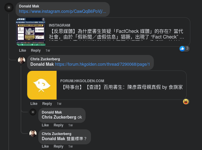 「書生」似乎沒有叫大家不作任何事實查核,他自己也在留言表示「其實書生認同 FACTCHECK的價值」,所以應不算雙重標準。(順帶一提,我建議大家認真去看那則帖文和大量指控《傳真社》的留言,相信會明白事實查核的重要和限制。)