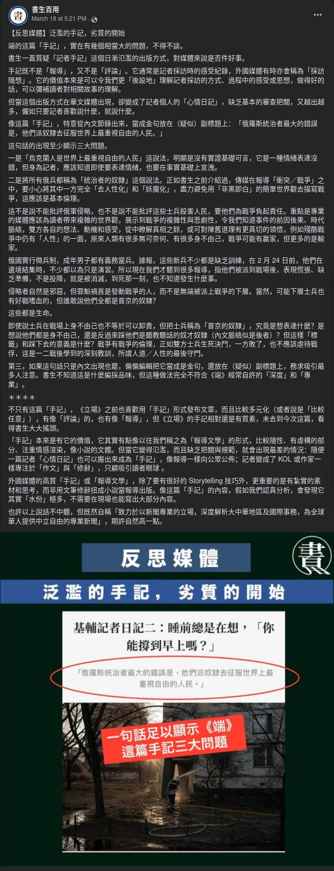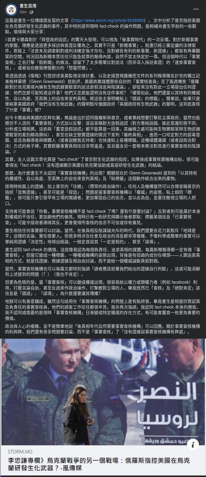 近日發現「書生百用」兩篇「反思媒體」的帖文已經刪除,下面補回截圖。本文刊出後一日,「書生百用」貼了一篇《風傳媒》的文章,內文引用Glenn Greenwald對事實查核的質疑,亦加插一些評論︰