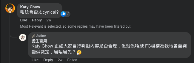 「書生百用」的帖文下有留言問其想法會否過於犬儒,「書生」的回應卻是「正如大家自行判斷內容是否合理,但係就唔駛FC機構為我地各自判斷做裁定,岩唔岩先?」