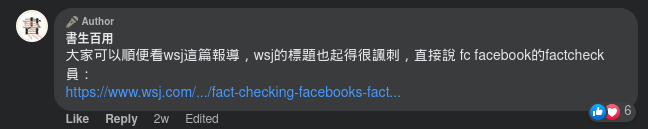 「書生」在文中指《華爾街日報》「 factcheck 了 facebook 的 factcheck 有問題」,內文他稱為「編輯評論」,在留言則指是「報導」︰