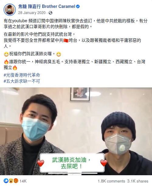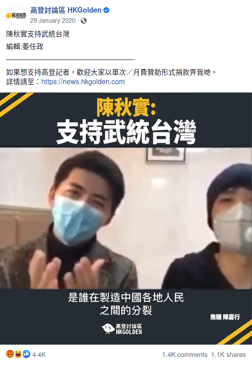 一年前,台灣網紅陳嘉行在Facebook指控陳秋實是中共統戰的樣板,並指他支持武統台灣。陳嘉行的帖文獲超過三千次分享,港台兩地亦有不少人轉述此說法(例如截圖中的香港高登討論區Facebook專頁,該影片也有逾千次分享)。