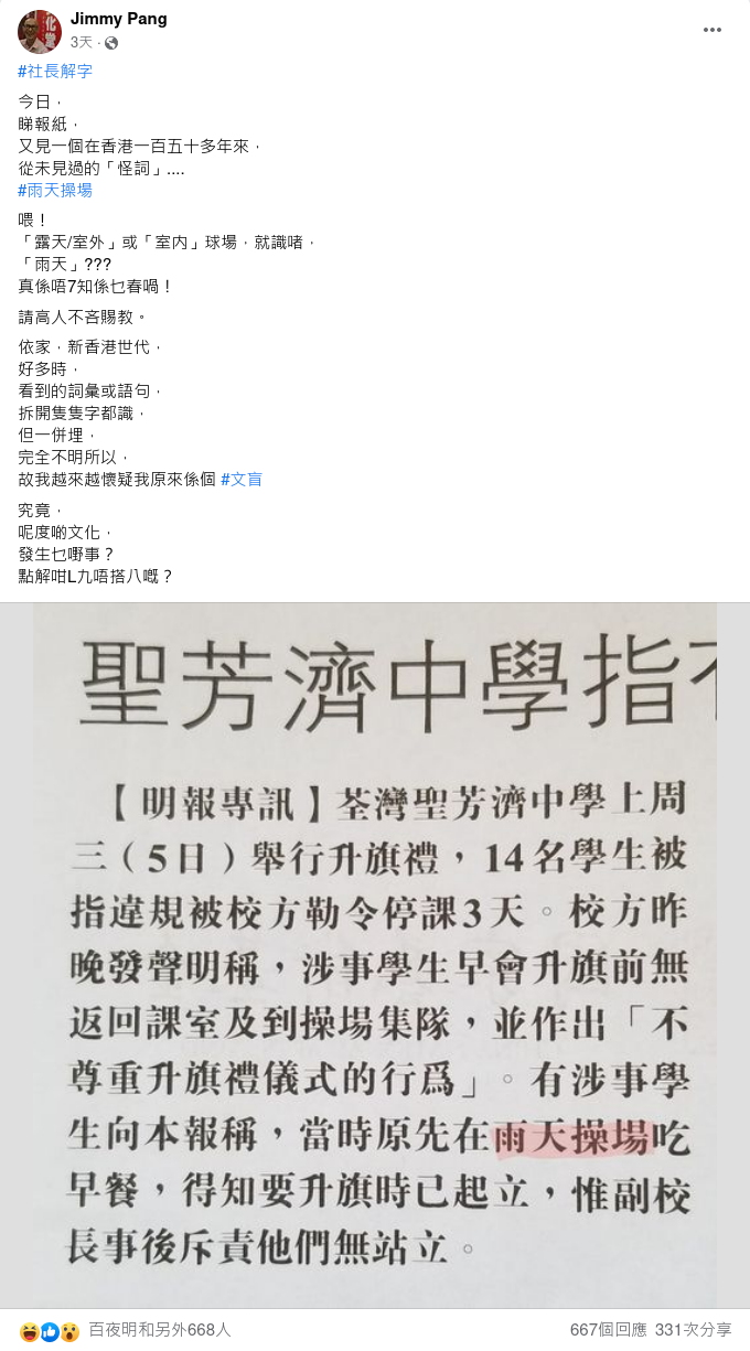 次文化堂社長彭志銘早幾日喺FB度貼篇《明報》新聞出嚟,話睇報紙「又見一個在香港一百五十多年來從未見過的『怪詞』」,呢個「怪詞」就係「雨天操場」,然後又話「真係唔7知係乜春喎」。