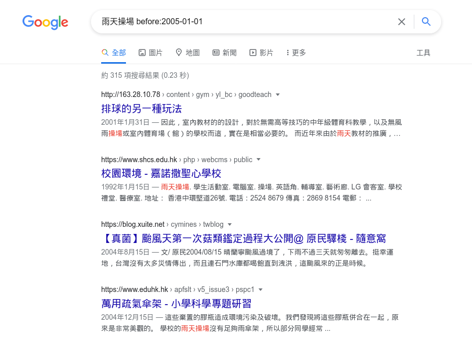 咁彭生可能會話係「新香港世代」用詞所以佢唔識,呢個時候我哋就應該收窄搜尋範圍,試下搵啲早啲時候用緊「雨天操場」嘅證據。例如想搵2005年之前嘅記錄,只要喺搜尋時加上「before:2005–01–01」就得(留意冒號同日期之間唔需要空格)。