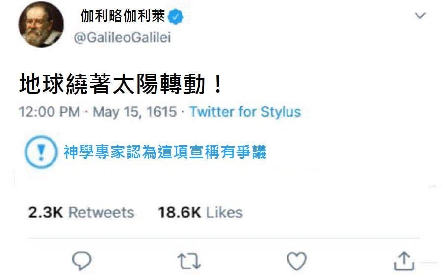 當然,今次美國大選的消息混雜得多(以真實程度而論),跟「曼德拉效應」這種不可否證的陰謀論有很大分別,但把「This claim is disputed」標籤跟教會對日心說的打壓類比,仍然非常不恰當(例如程度有明顯分別)——只是很容易勾起那種「他們在打壓我們」帶來的情緒,因此適合製成meme就是了。
