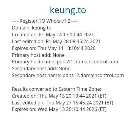 最後講一個跟註冊域名有關的小故事。話說我其中一個無聊興趣是想一些domain hack,再查看是否有人註冊。早前想到的一個是“keung.to”,觀察了一段時間仍未有人註冊,我自己也沒有註冊,只告訴了某位姜糖友人,後來就見到域名在五月中左右被註冊了。我沒問友人有否註冊,但正所謂姜濤不紅天理不容,我較感意外的是之前沒人想到註冊這域名,現在有人註冊了倒非常合理。(2024-02-25按︰現在發現此網址會轉往 privateemail.com,與姜濤無關。)
