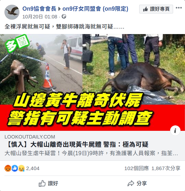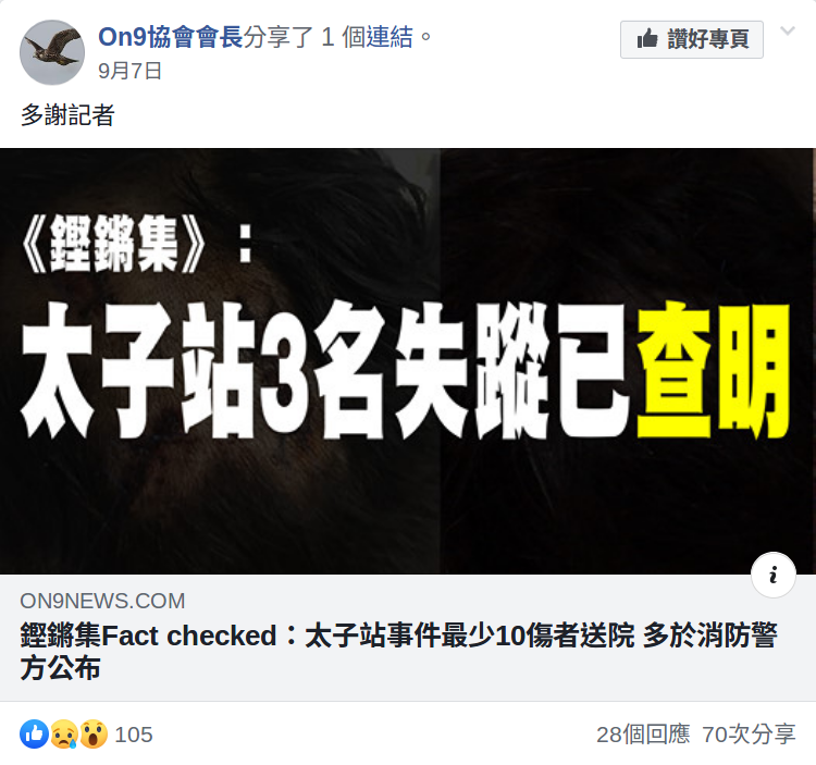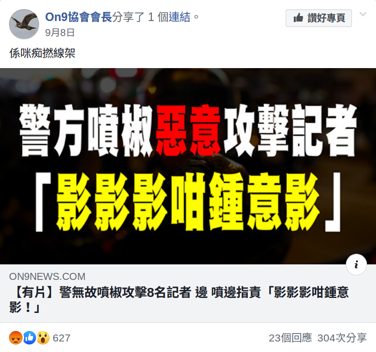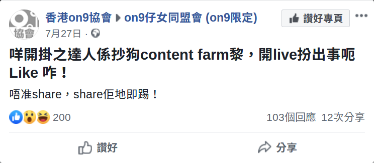 - 2019年7月27日,on9協會出post批評另一個page「開掛之達人」係「抄狗content farm」
