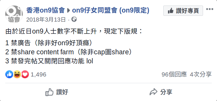 - 2018年3月13日,on9協會定下版規,禁share content farm。
