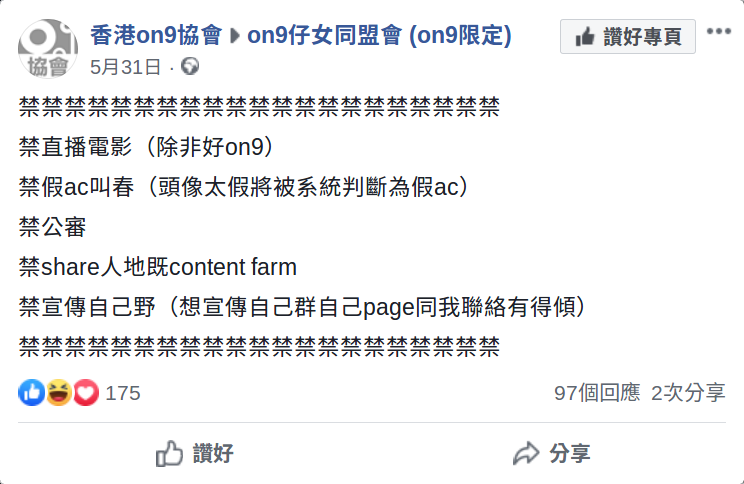- 2019年5月31日,on9協會出post禁止「share人地既content farm」