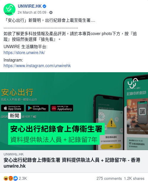 今年3月有媒體報導指「安心出行」記錄會上傳衞生署,例如最多share嘅應該係《UNWIRE.HK》︰