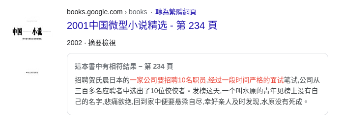 這個原始故事跟李怡的版本不同,按日本、美國、德國及中國四個國家分為四部分(有些台灣網站後來流傳的版本加入了台灣的部分)。各部分開頭都是「日本/美國/德國/中國的一家公司要招聘10名員工,經過一段嚴格的面試公司從三百多應徵者中選出了10位佼者…」,然後都是說放榜當日一名青年發現榜上沒有自己名字,回家要自殺,但幸好親人及時搶救沒死去,青年的名字和自殺方法則按國家調整,例如日本部分是叫「水原」的青年切腹自殺,美國部分是叫「湯姆」的青年舉槍自殺(李怡的「懸樑自盡」來自中國部分)。接下來就是公司指電腦錯誤,該青年並未落選,而最後的結果則各國有別。