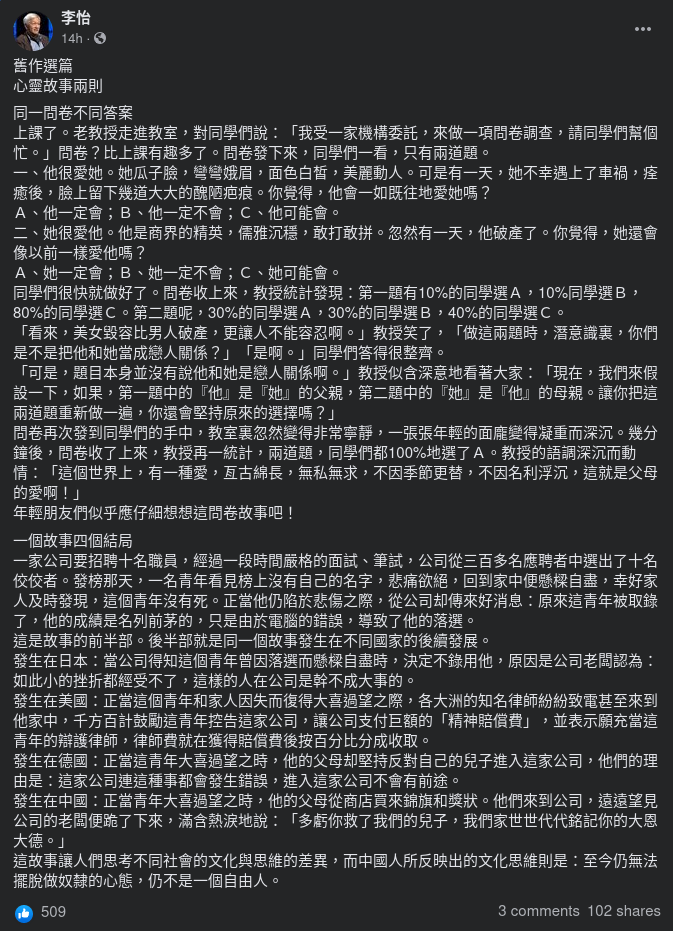 李怡在其Facebook專頁以〈舊作選篇 心靈故事兩則〉為題,貼出兩個故事,短短十數個小時已有逾500讚好過百次分享︰
