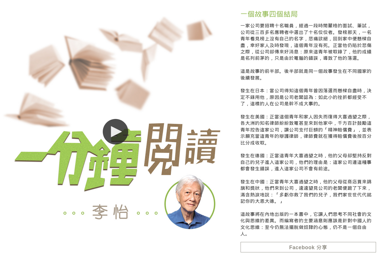 第二個故事則來自第896集《一分鐘閱讀》,但網站並無顯示播放日期,若以每星期播出五集、最新為4659集推算,第896集播放日期應在2006年至2007年之間,這個答案跟李怡在《經濟日報》上相同標題的專欄文章發表日期(2006年8月2日)接近,以下假設李怡最先於2006年8月發表此文。
