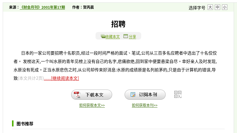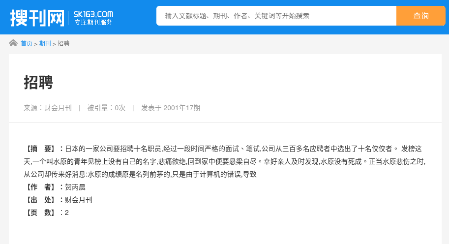 在Google搜尋故事第一句並限制顯示2006年8月前的結果,可找到一個叫「江南圖書館」(261731.com)指有個類似故事發表於2001件17期的《財會月刊》,標題為「招騁」,作者叫賀丙晨。