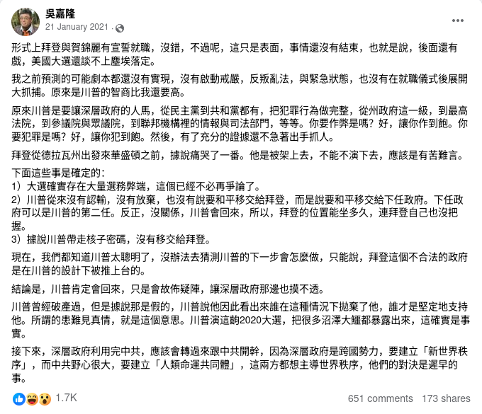 無論如何,假如林伍德不是出現妄想症狀的話,那就肯定有意散播假消息給那些陰謀論者,讓他們繼續幻想特朗普沒有輸。