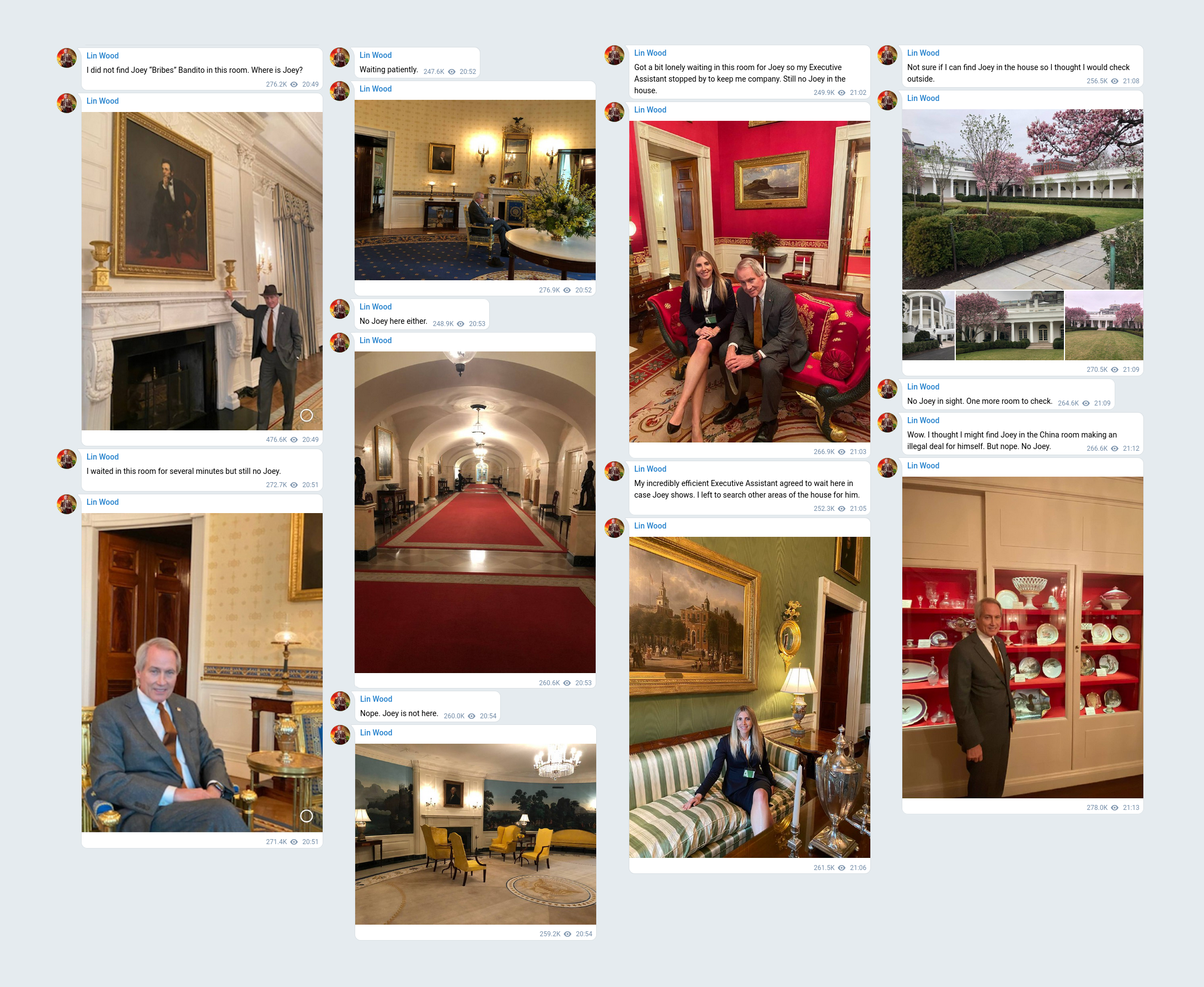 話說有些人相信拜登並未真正入主白宮,而4月28日林伍德在他的Telegram頻道貼出多個訊息並附上照片,宣稱在白宮找不到拜登︰