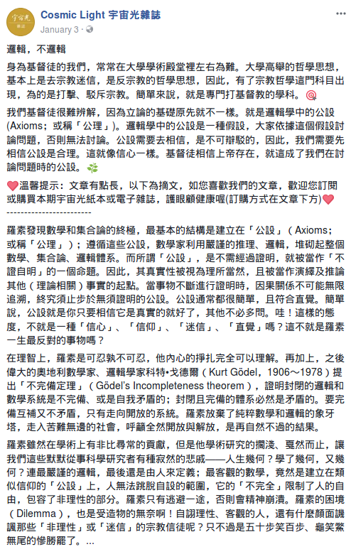 看到某基督教雜誌這段貼文,當堂嚇一跳,然後得啖笑。我是個無神論者,又是讀數學的,對數理邏輯有點研究,剛好可以簡單回應一下。(第一段就留給哲學人回應。)
