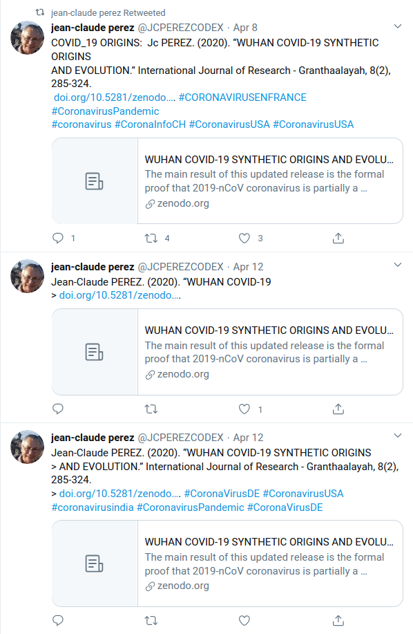 RFI第一篇報導無提、第二篇先有提到Montagnier嘅證據嚟自同Jean Claude Perez嘅研究,而我只係搵到呢位Perez嘅Twitter,無跡象顯示佢喺學術界工作,而且佢Twitter係咁貼佢篇文條link出嚟,非常奇怪︰
