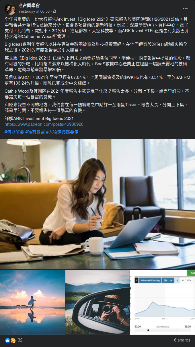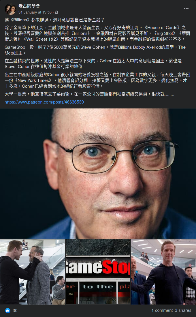 說回本文重點,李怡抄襲一事令我想起「老占」,於是去其Facebook專頁看一下,發現他開了Patreon。而他近日一則關於《Billions》的帖文,就像不少Patreon用戶一樣,在Facebook貼出部分內容,再附上Patreon用戶的連結︰