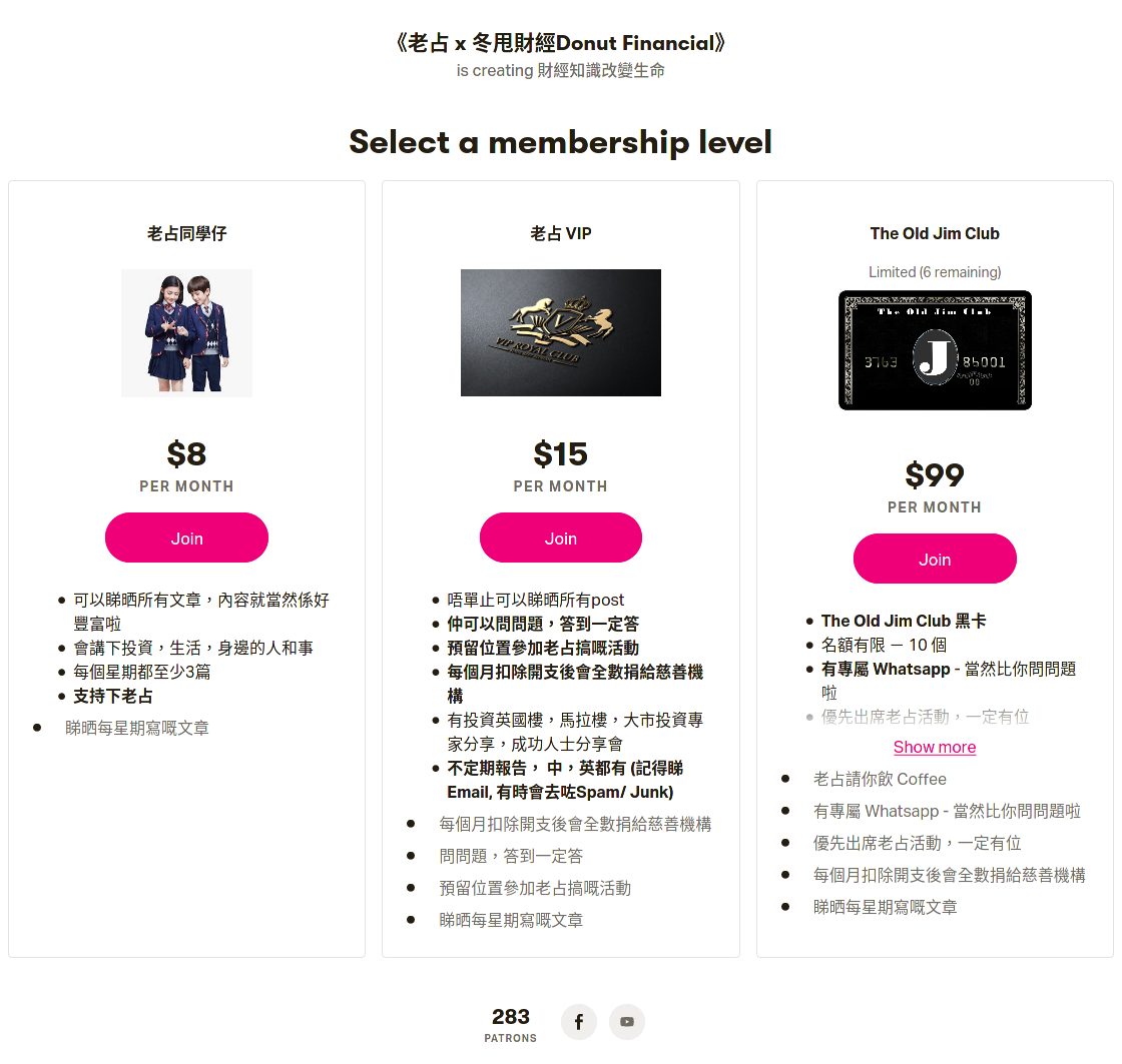 他的Patreon目前有283人訂閱、月費8美元起,以此計算即每月收入最少也有約萬七港元(未扣除平台費用)︰