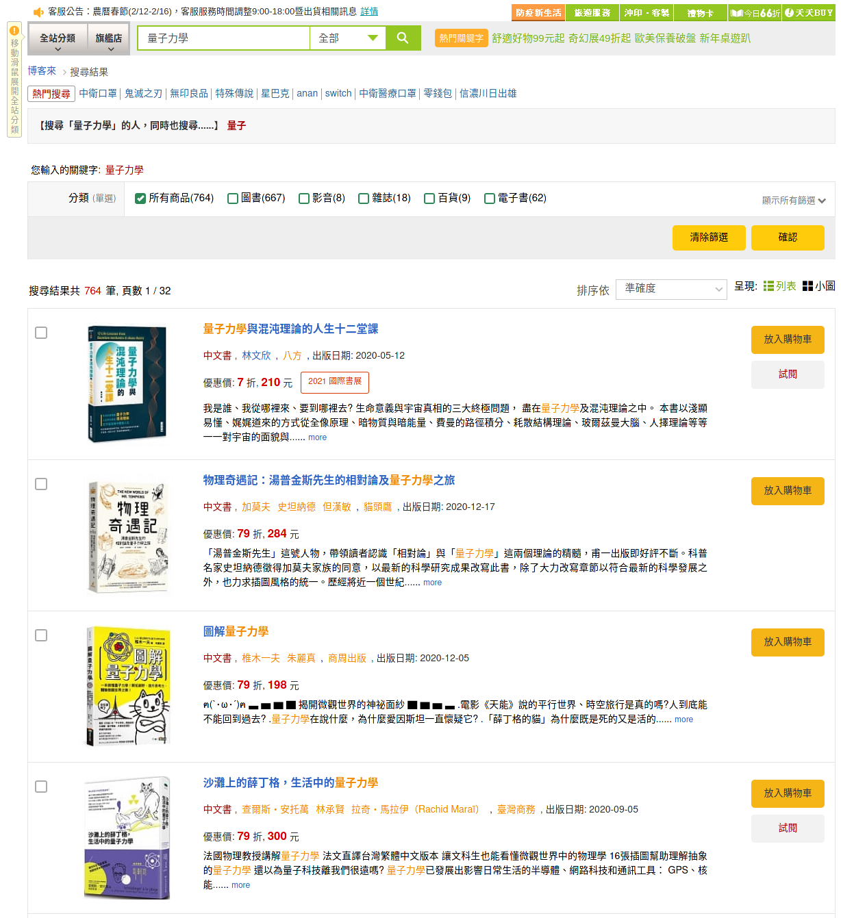收到博客來的電郵通知,告訴我有張優惠券快要到期,於是去看看有沒有甚麼書想買。隨便在網站上搜尋一些關鍵字,剛好輸入了「量子力學」,排首位的竟然是林文欣那本《量子力學與混沌理論的人生十二堂課》︰