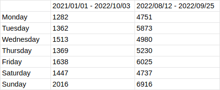 首先,機場入境人次應唔應該用一個星期去睇?港台個計法係咪「未見有特別意義」?睇到呢句我都覺得奇怪,印象中以往星期日多啲人返嚟,事關好多人都係返星期一至五。但既然有數據就唔使做印象派,我計咗由2021年頭到尋日,同埋由今年8月12到9月25(「3+4」落實期間)星期一至星期日嘅平均人次︰