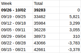呢度可以見到入境人數由8月中到9月下旬其實係跌緊,所以「0+3」之後個回升都幾明顯,當然淨係同上一星期比較就多咗成五千幾人,如果係同早兩三個星期比較,就只係多三千人左右,而同8月尾9月頭個星期比較就無乜乜分別,同8月中至8月尾比較,就仲爭三千幾人。陳珏明計到嘅1.52%,明顯係俾較早時段嘅數字拉低咗。