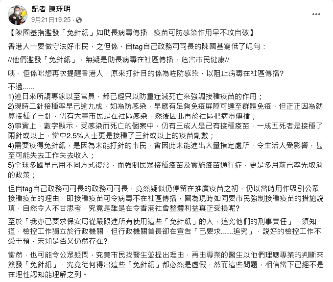 同上面完全無關係,不過寫開就順便講埋,年頭講過陳珏明質疑袁國勇嗰陣打咗稻草人(梁啟智都有份但似係俾《獨媒》誤導,同埋有更新帖文),篇文同時提到佢講疫苗數據時有問題︰