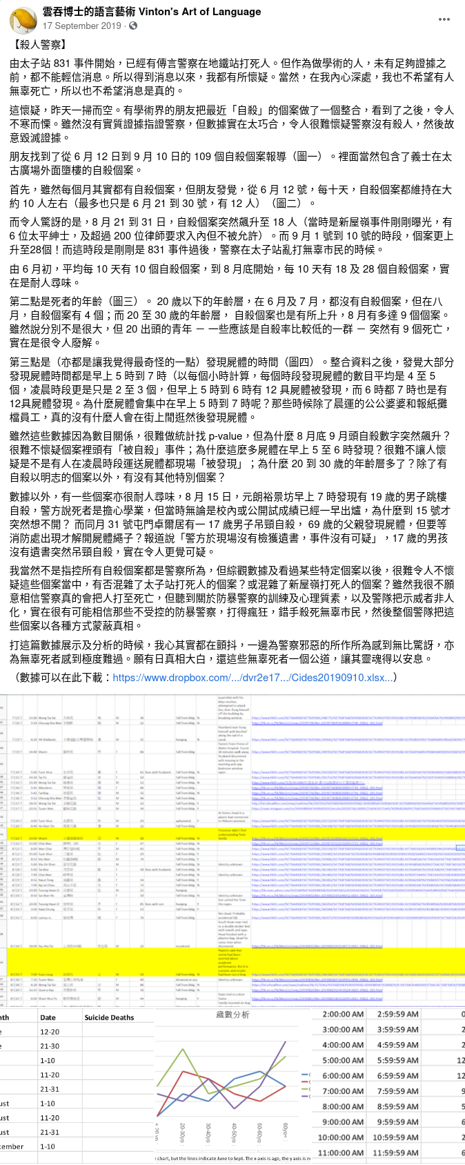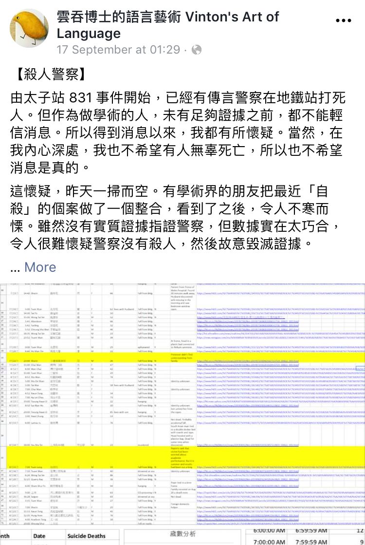 由語言學博士潘永堅(Vinton Poon)打理嘅Facebook專頁「雲呑博士的語言藝術 Vinton’s Art of Language」喺9月17日岀咗一篇〈殺人警察〉,聲稱自己係學術人,未夠足夠證據唔咁易輕信太子站831打死人,但當佢分析佢一位「學術界朋友」整理嘅自殺記錄後,佢認為「令人很難懷疑警察沒有殺人,然後故意毀滅證據」。