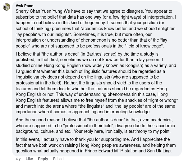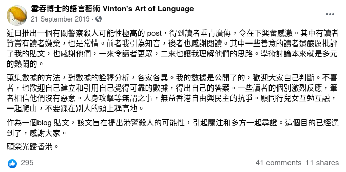 - 佢掛博士個名岀嚟,文中強調學術,用錯數據誤導大眾,而且篇文廣傳(FB 18K share,連登熱門post),有錯唔認唔可以姑息。唔好以為質疑警察、可以令大家關注831事件就無問題,錯誤資訊對整個運動有害無益。
