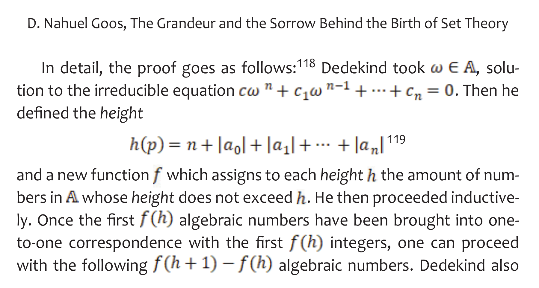 - “When Cantor posed the problem of the denumerability of ℝ, on November 29, Dedekind answered that he was unable to solve it, but at the same time he stated and proved the theorem on the denumerability of the set of algebraic numbers [Cantor & Dedekind 1937, 18]. Although Dedekind's letter is no longer extant, the point is confirmed by Cantor's next letter, acknowledging receipt of the proof on December 2 [Cantor & Dedekind 1937, 13]. Now, as Dedekind wrote, "after a short time, this theorem and its proof were reproduced almost literally, including the use of the technical term 'height' [HOhe], in Cantor's article" [Cantor & Dedekind 1937, 18] (cf. [Cantor 1874, 116]).” (Ferreirós 1993, p.349)