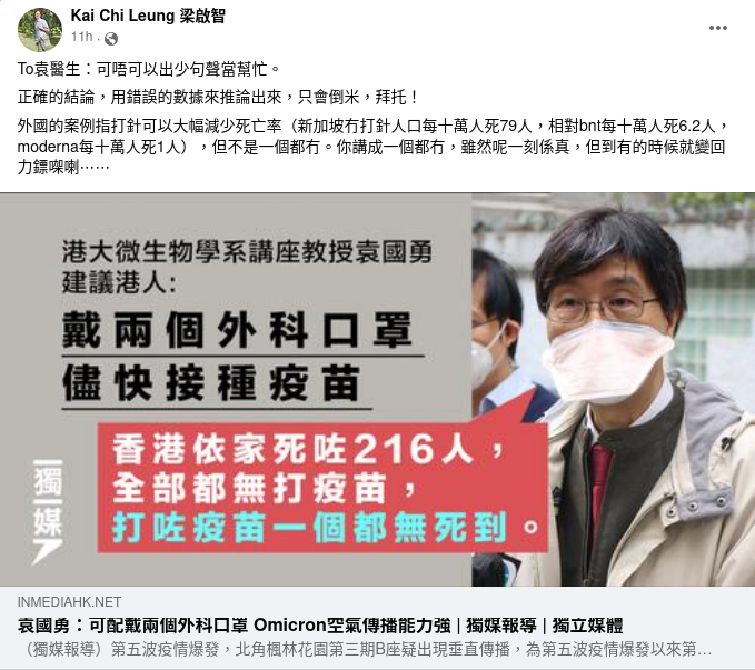 在同一段發言中,袁國勇也呼籲市民盡快接種疫苗,《獨立媒體》的報導引述其言論中一句「香港依家死咗216人,全部都無打疫苗,打咗疫苗一個都無死到」,同時以這句話製作封面圖片。這句話引來梁啟智批評(梁已更新帖文指「《獨媒》的引文可能有斷章取義」,詳見下文)︰